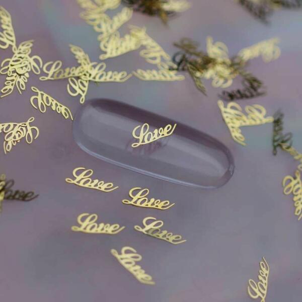 Metál körömdíszítő lemez, arany színű Love felirat. Egyszerűen használható, hajlítható körömdíszítő mely kiválóan kombinálható arany színű szegecseinkkel, változatos színvilágú strasszköveinkkel.