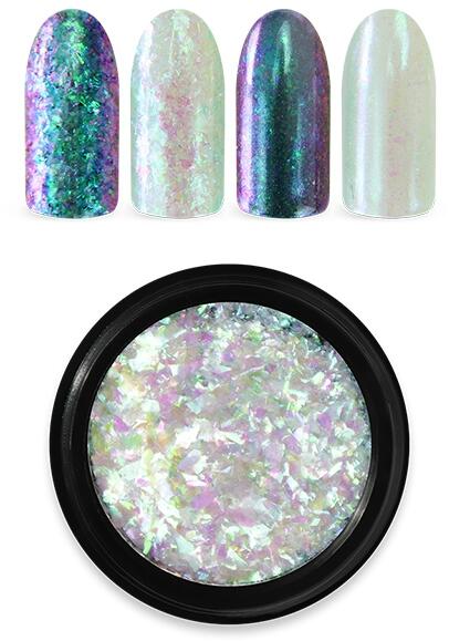Gyönyörű színekben irizáló, kifejezetten könnyed, pehely állagú díszítő por. Keverhető fényzselébe, zselébe és porcelánba egyaránt. Beépíthető műkörömbe, de körömlakk és lakkzselé ragacsos felületére is tökéletesen rátapad és magasfényű ragyogást biztosít. Kiköttetett fixálásmentes felületbe dörzsölve nagyrészt eltűnik a pehely állag és a bogarak ki