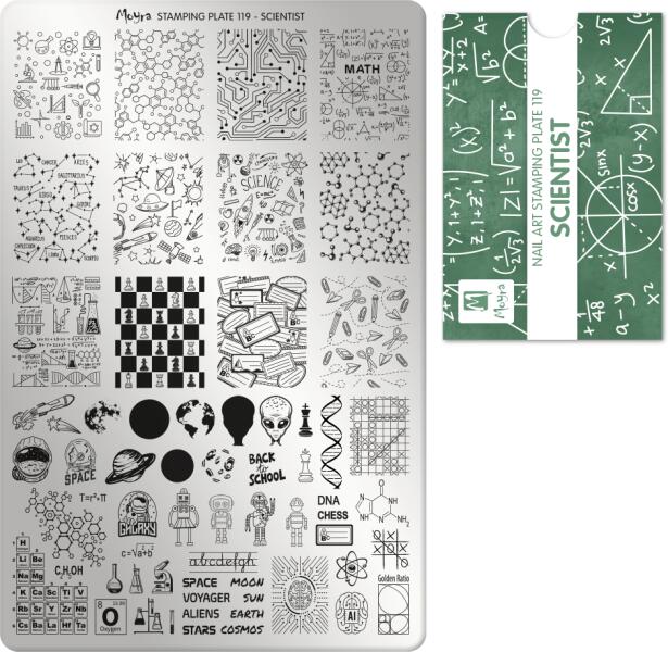 Alkoss izgalmas és misztikus körmöket No. 119 Scientist nyomdalemezünk mintáival! Engedd el a fantáziádat: fedezd fel, hogy mit rejt a galaxis, lépj be a robotika világába vagy válassz egy adott tudományághoz köthető izgalmas mintát körmeidre!