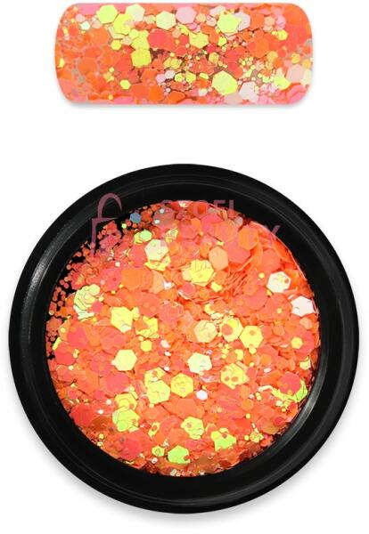 Különlegesen szép és csillogó, intenzív holografikus fénnyel ragyogó finom őrlésű csillámpor és hexagon glitter keveréke. A kisebb és nagyobb szemek együtt extra ragyogást biztosítanak. Gyönyörűen mutat a köröm teljes felületén, vagy kiegészítő díszítésként. Használható körömlakk és lakkzselé ragacsos felületén, fényzselébe, építő- és ragasztózselébe