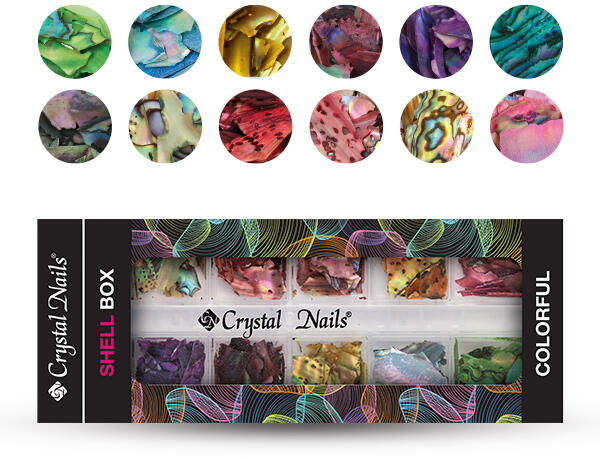 12 féle különböző színű tördelt kagyló, összesen 12 rekeszben. A díszítő felhasználását követően a tároló praktikus nail art rendező eszköz lehet