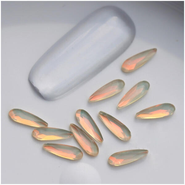 Csepp alakú formakő 8*3mm-es Peach Opal színben. Különleges színvilágú hosszúkás cseppforma. Flatback ragasztható üveg körömdísz.