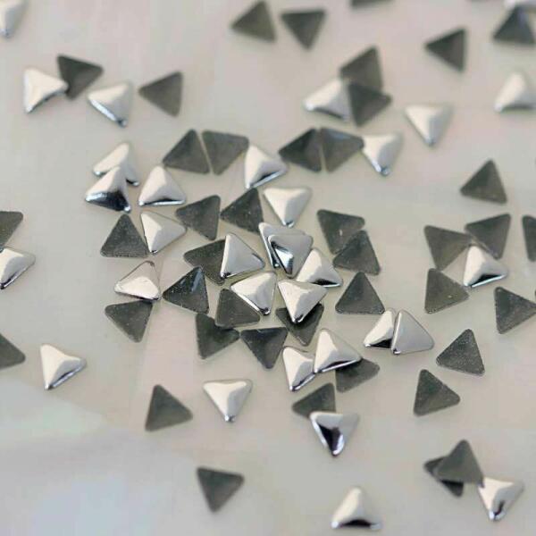 Szegecs körömdísz háromszög formában ezüst színben, nagyszerűen kombinálható különböző méretű és formájú szegecseinkkel, ezüst színű szórógyöngyeinkkel, szikrázó strasszköveinkkel. Vékony, hőre olvadó ragasztórétegének köszönhetően ruhadíszítésre is kiválóan alkalmas.