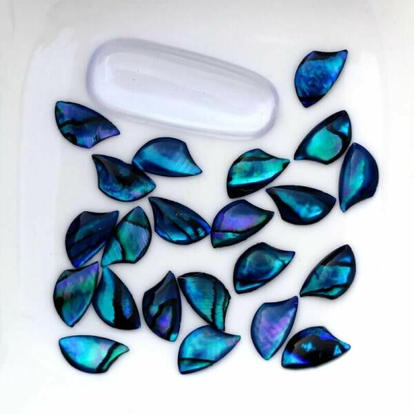 Kagyló körömdísz kékes árnyalatban. Cápauszony forma. Minden darab eltérő mintázattal.