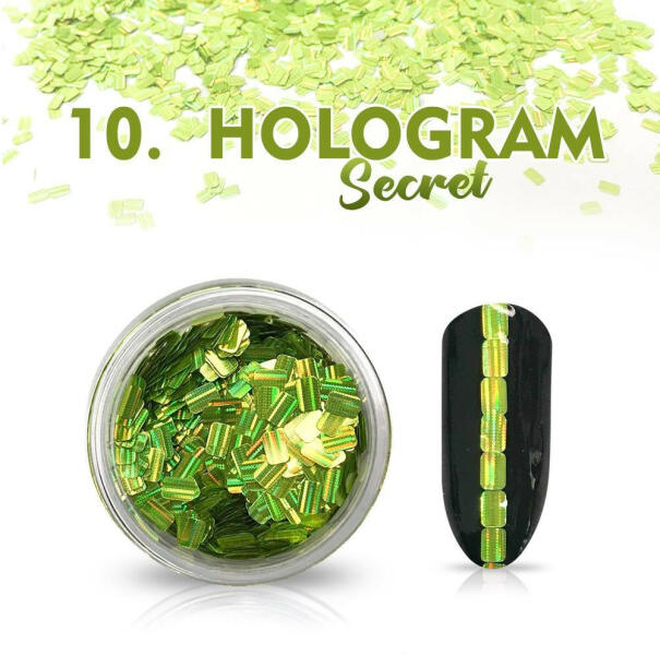 A Hologram Secret 10 egy holografikus, csillogó körömdísz, amely meglepő kompozícióvá varázsolja manikűröd. Lehetőség egy adott minta elrendezésére vagy a teljes köröm lefedésére. A dekoráció alkalmas gél lakkra, zselébe ágyazva vagy hagyományos körömlakkra. Nappali és mesterséges fényben is szépen csillog. Hogyan kell használni a Hologram Secret díszítő pelyhet?