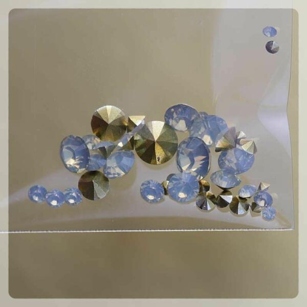 Körömdekoráció rivoli formában fehér opál színben. Egymással is nagyszerűen kombinálható, különböző méretekből összeállított műanyag körömdísz. A napfény az opálos színvilágból kihozza a tükrös csillogást. Összetett díszek népszerű alkotója.