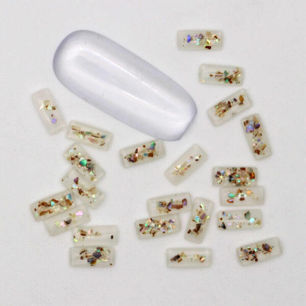 Kagyló körömdísz, műanyag lapos aljú hasáb formában, fehér színben. Kagylódarabokkal díszítve. Minden darab eltérő mintázatú.