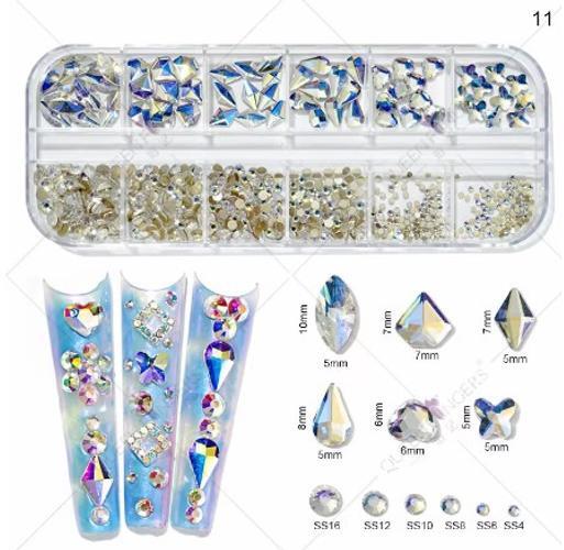 Kiváló minőségű, magasfényű körömstrassz 12 rekeszes műanyag visszazárható tartóban. Kerek strassz 6 méret, SS3-SS10 Formastrassz 6 forma Szín: ezüst