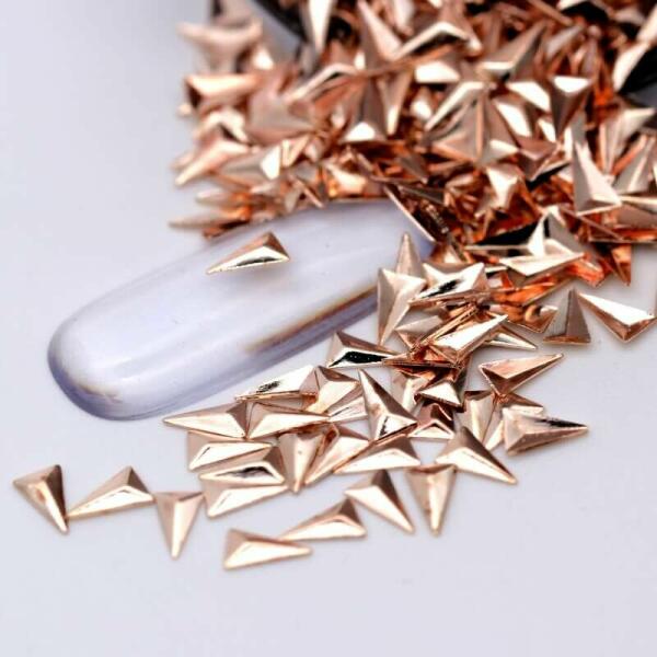 3*5mm-es, fényes, rózsaarany háromszög szegecs körömdísz. 40db/cs.