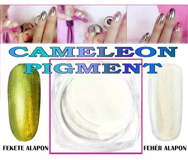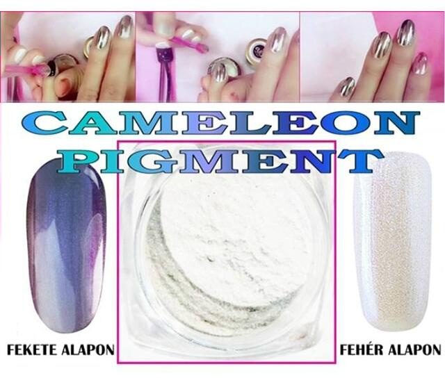 Cameleon pigment por, a körömdíszítés különlegesen egyedi lesz ha ezt használod. A végeredmény a kiválasztott alapszíntől függ! Minden színen más-más végeredményt kapunk. 1: Felvisszük a kiválasztott színt. 2: Lámpában megköttetjük. 3: Fixálást nem igénylő fedőanyagot (pl: Top Gél) viszünk fel rá. 4: Lámpában félig megköttetjük. 5: A Cameleon Pigment-port apl