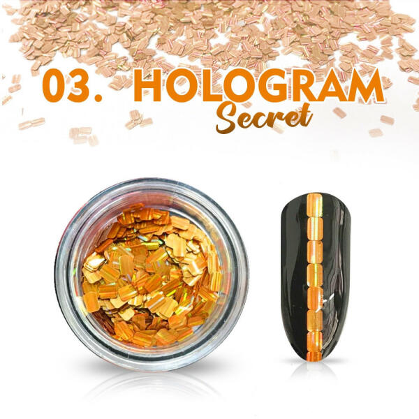 A Hologram Secret 03 egy holografikus, csillogó körömdísz, amely meglepő kompozícióvá varázsolja manikűröd. Lehetőség egy adott minta elrendezésére vagy a teljes köröm lefedésére. A dekoráció alkalmas gél lakkra, zselébe ágyazva vagy hagyományos körömlakkra. Nappali és mesterséges fényben is szépen csillog. Hogyan kell használni a Hologram Secret díszítő pelyhet?