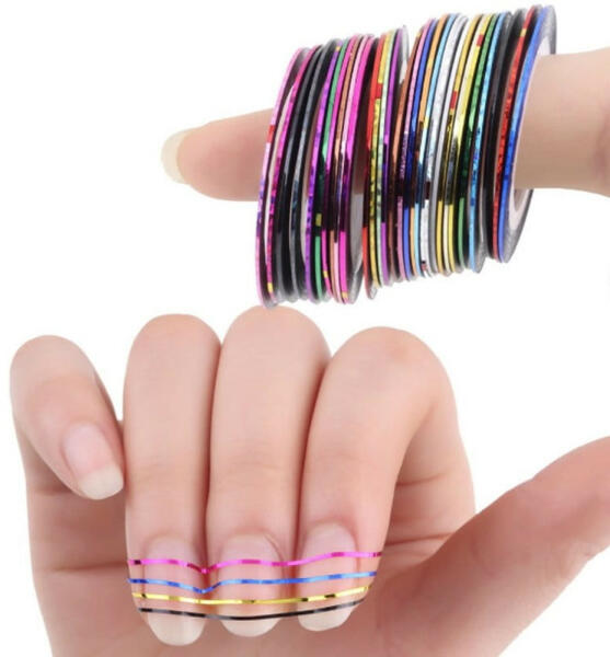 Az Öntapadó díszítő csík 5 db, professzionális díszítő szalagok, melyek tökéletesek a zselés, akril és természetes körmök díszítésére. Minden tekercs 20 méter 1 milliméter széles szalagot tartalmaz. Ez a szalag öntapadós, ami rendkívül egyszerűvé teszi a használatát. 1 csomag 5 különböző színű szalagot tartalmaz.