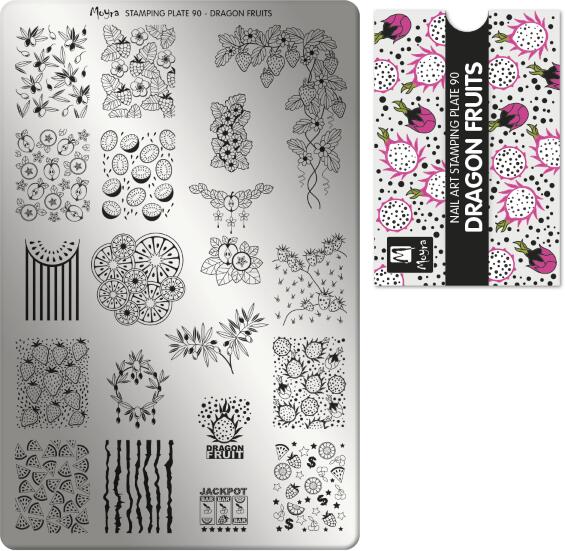 A Moyra körömnyomda lemezek sorozata folyamatosan bővül! A professzionális minőségű, nagyméretű No. 90 Dragon fruits körömnyomda lemez segítségével percek alatt különleges körmöket készíthetsz akár otthon, akár a szalonodban. Egyszerű használhatóság, garantált siker. A közel 2000 – többnyire egész körmöt, műkörmöt befedő, nagyalakú – minta között mindenk