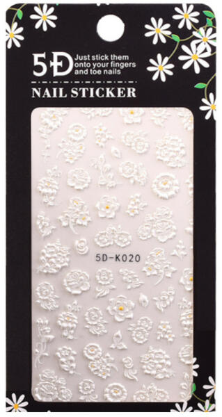 Nagy méretű, öntapadós körömdíszítő matrica 5D-K020 Öntapadós matrica felhelyezése: vedd fel az ötapadós matricát csipesz, narancspálca, vagy az ujjad segítségével és helyezd a köröm felületére (a kiköttetett színre). Nyomkodd rá, hogy tökéletesen illeszkedjen, majd használj egy réteg fedőlakkot.
