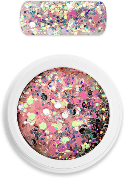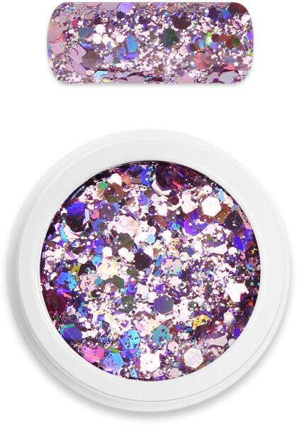 Különlegesen szép és csillogó, intenzív holografikus fénnyel ragyogó finom őrlésű csillámpor és hexagon glitter keveréke. A kisebb és nagyobb szemek együtt extra ragyogást biztosítanak. Gyönyörűen mutat a köröm teljes felületén, vagy kiegészítő díszítésként. Használható körömlakk és lakkzselé ragacsos felületén, fényzselébe, építő- és ragasztózselébe
