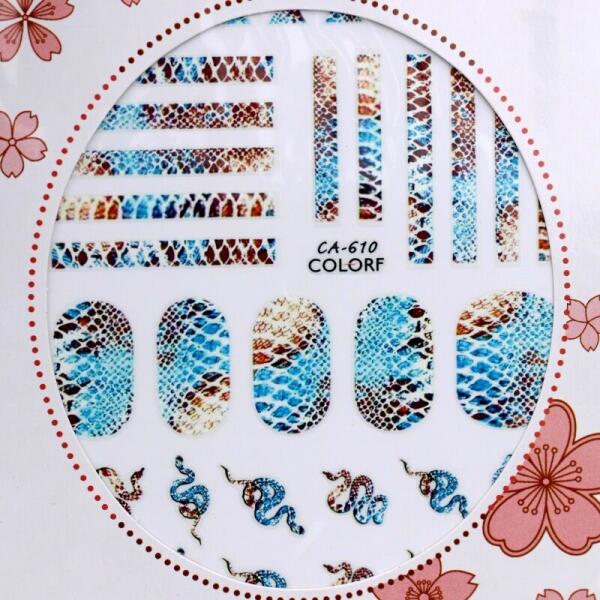 Körömmatrica Snake 3D-s kivitelben, színes kígyóminta. Matt, bufizott, portalanított felületre helyezve, 2 réteg fedővel, egyszerűen használható körömdíszítő, önmagában is kitűnő dekoráció.