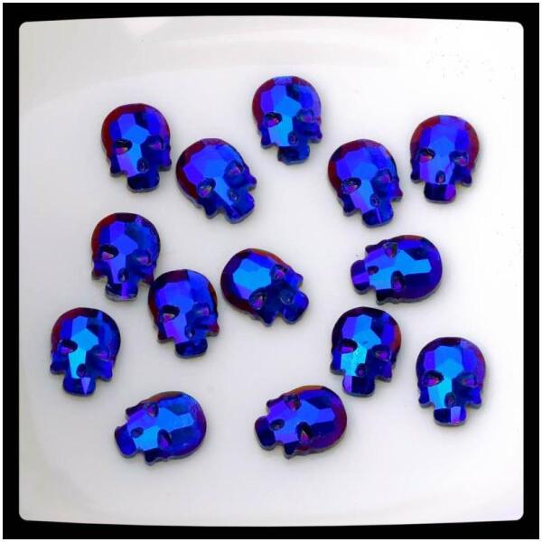 Strassz formakő körömdísz Sapphire AB színjátszó színben. Koponya formájú üvegdekoráció, flatback ragasztható üvegforma mely kíválóan alkalmas merész kompozíciók megvalósítására. Glue gél segítségével könnyen és tartósan körömre ragasztható, érdekes színvilága miatt is feltűnő jelenség.