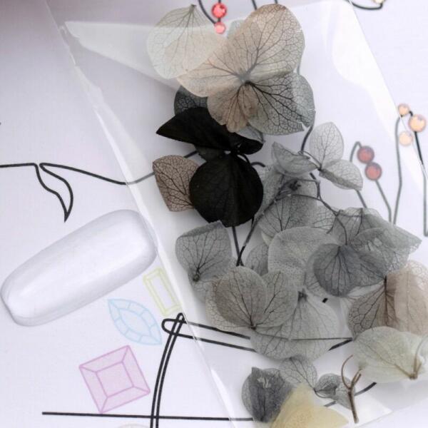 Szárított virágszirmok hatású körömdekoráció szürkés színvilágban. Tavaszi-nyári körömdíszítés egyik népszerű eleme ez a vékony, beépíthető virágszirom utánzat.