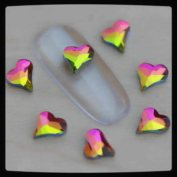Strassz formakő Rainbow színváltós színben. Népszerű, flatback ragasztható szív alakú üvegforma körömdísz. Glue gél segítségével tartósan a körmön marad, kíválóan kombinálható egyedi strassz formáinkkal, különleges körömékszereinkkel, szórógyöngyeinkkel.