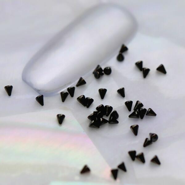 Szegecs körömdísz grafit színű aluminium gúla. Extrém körömdekorációkhoz ajánljuk. Kb. : 1.5mm átmérőjű és 2mm magas. Nagyszerűen kombinálható grafit színű szegecseinkkel, fém, mágnesezhető szórógyöngyeinkkel.