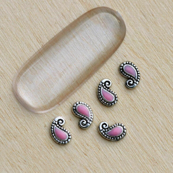 5*3mm-es indián körömdekoráció. Ezüst alapon rózsaszín kővel. 10db/cs.