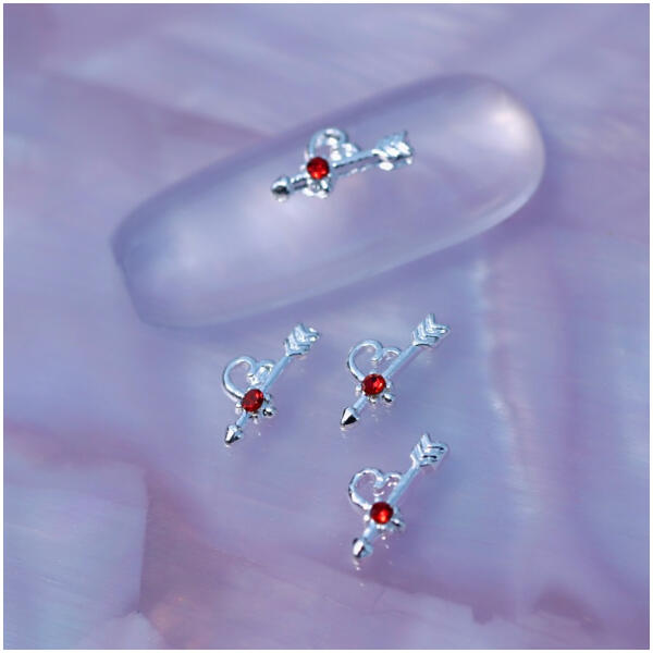 Strasszköves körömdísz, ezüst színű nyílvessző forma, piros színű strasszkővel. Egyedi körömdíszítő, kreatívan kombinálható különleges színvilágú strasszköveinkkel, szórógyöngyeinkkel. Glue gél segítségével tartósan a körömfelületre rögzíthető.
