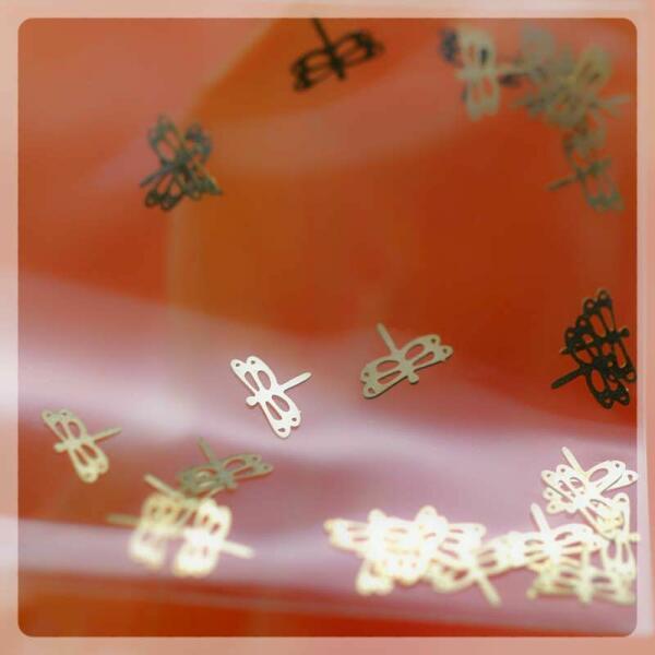 Metál körömdíszítő lemez vékony, arany színű szitakötő forma. Könnyen a körömfelületre helyezhető, önmagában is feltűnő díszítő. Kiválóan kombinálható szórógyöngyeinkkel, különleges színvilágú strasszköveinkkel.