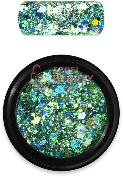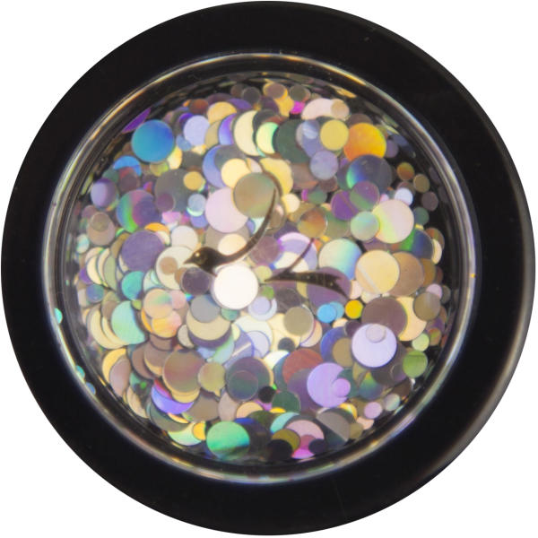 Különlegesen szép és csillogó, intenzív holografikus fénnyel ragyogó finom őrlésű csillámpor és hexagon glitter keveréke. A kisebb és nagyobb szemek együtt extra ragyogást biztosítanak. Gyönyörűen mutat a köröm teljes felületén, vagy kiegészítő díszítésként. Használható körömlakk és lakkzselé ragacsos felületén, fényzselébe, építő- és ragasztózselébe
