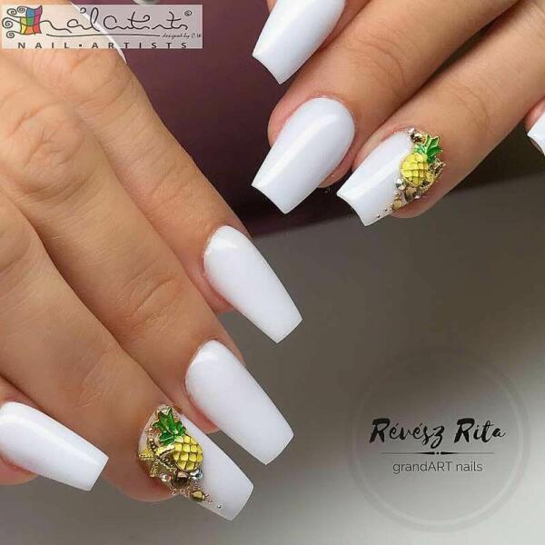 Körömdekoráció ananász formában. Fém körömdísz, hajlított aljának köszönhetően könnyen fekszik fel a köröm felületére. Glue gél használatával tartósan a körmön marad. Nagyszerű nyári forma mely kíválóan kombinálható strasszköveinkkel, különleges kiegészítőinkkel.
