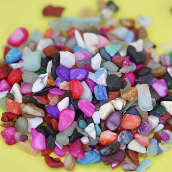Körömdekoráció, vegyes színvilágú és eltérő formájú nagyméretű színezett kavicsok. Bármilyen felületet izgalmassá varázsolhatunk ezzel a sokszínű dekorációval.