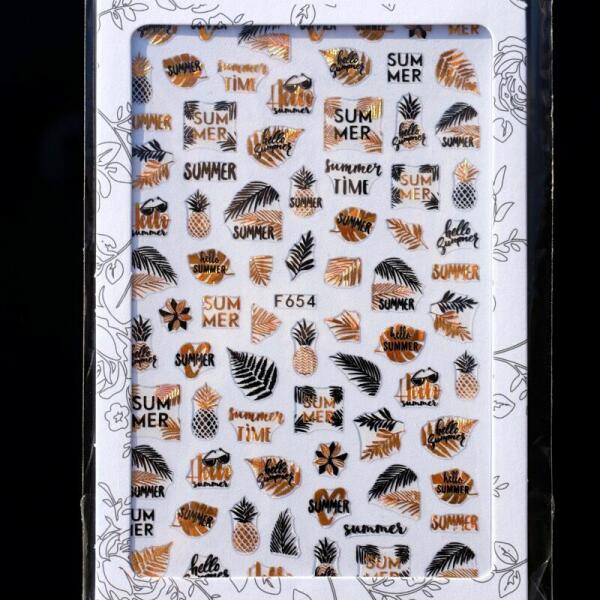 Körömmatrica Summer 3D-s kivitelben, arany-fekete színjátszó nyári formák, műanyag alapon. Matt, bufizott, portalanított felületre helyezve, 2 réteg fedővel, egyszerűen használható körömdíszítő, önmagában is kitűnő dekoráció.