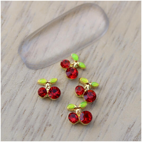 Cherry körömdísz. Cseresznye körömdekoráció piros strasszkövekkel, nyári díszítő forma.