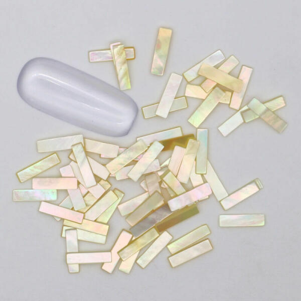 Kagyló körömdísz, hasáb formájú tengeri kagylódarabok. Minden darab eltérő mintázatú, egyedi, különleges körömdísz törtfehér-rózsaszínes árnyalattal.