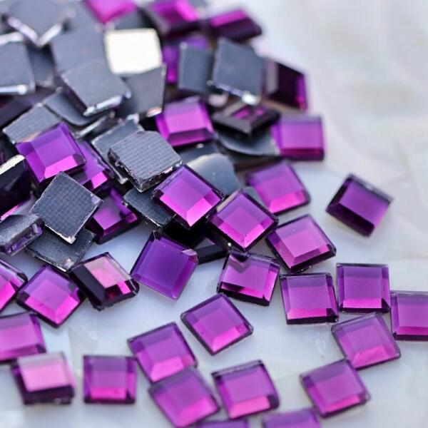 Budget minőségű vasalható üvegforma amethyst négyzet. Nagyobb mérete (5mm), és minősége miatt elsősorban ruhadekorációkhoz ajánlott.
