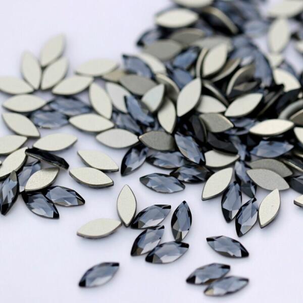 Swarovski formakő Marquise Black Diamond üvegforma, csodás grafitszürke színű zabszem forma üvegdísz, flatback, no hotfix. Kreatívan felhasználható köröm, smink, ajándéktárgy díszítésre. Ragasztható, glue gél segítségével egyszerűen fixálható. Kombinálható Swarovski black diamond, silver night színű strasszkövekkel és egyéb különleges formáinkkal.