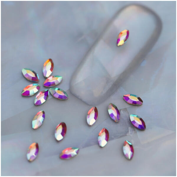 Strassz formakő körömdísz színjátszó színben mini levélformában. A népszerű strassz formák egyike közkedvelt színjátszó színvilágával különleges díszítő kombinációkat alkothatunk vele. Kíválóan alkalmazható strasszköveinkkel, szórógyöngyeinkkel. Flatback no hotfix típusú, ragasztható üvegforma.