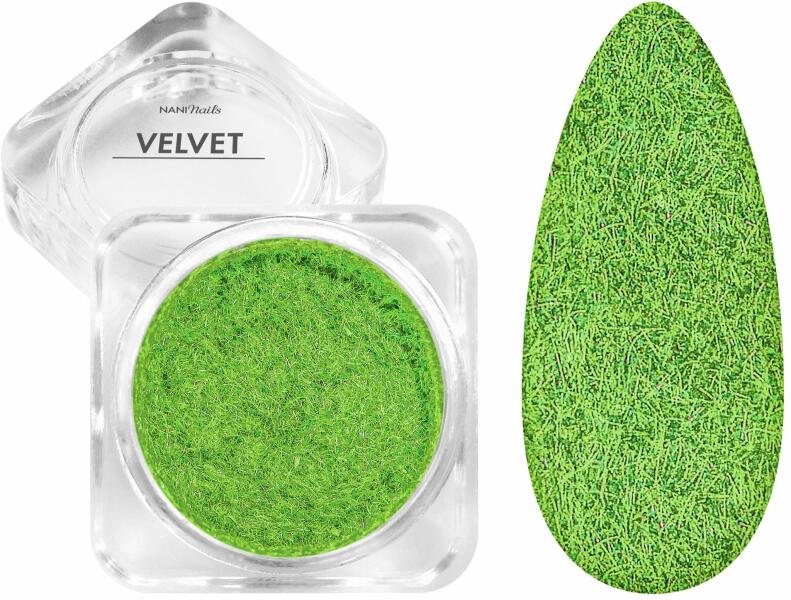 A Velvet Pigment bársonypor egy nagyon specifikus dekoráció, amelyet nem köttetett színalapra vagy végső felületre használnak a körmök bolyhos/fluffy hatásáért. Ez a díszítés utolsó szakasza, amelyre a finish-t már nem alkalmazzák. 1,5 g pigment van a csomagban. Az üvegcse mérete 3x3 cm.