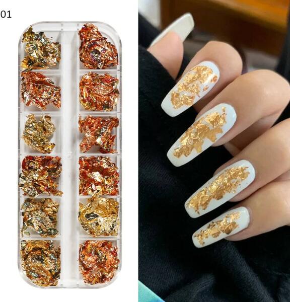 Leheletfinom, pehelykönnyű fólia darabok. Ragacsos felületre óvatosan felvihető, vagy beleépíthető különböző acrilokba, zselékbe.