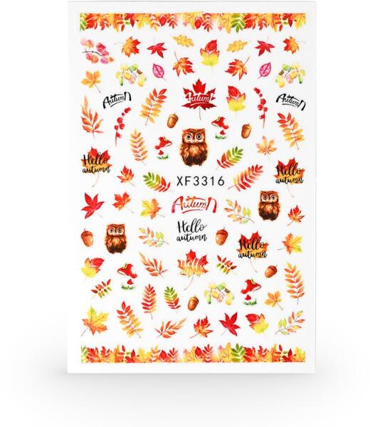 Őszi mintázatú körömmatricák két íven, összesen több, mint 120 db. egyedi motívummal és két teljes ívszélességben futó levélsorral, mely tetszőleges méretre szabható. A matricákat a papír hátlapról víz nélkül, csak egy csipesz vagy tű segítségével kell eltávolítani. A köröm díszítő matricák könnyen és gyorsan használhatók a műkörömkészítés díszít