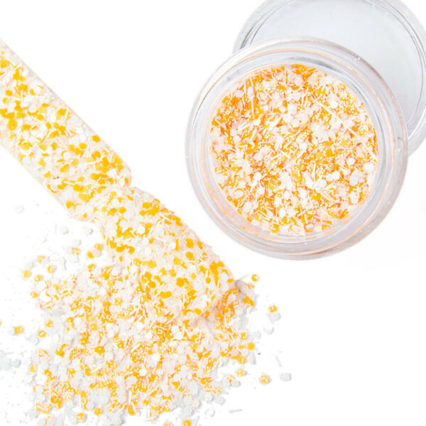 A Rush Effect Nr. 10 k ülönböző textúrájú és formájú részecskék kombinációja fehér és narancssárga színben. Tökéletes kiegészítője bármilyen stílusnak. Forró nyári dekorációk, csak is a legújabb effekt porral a Rush Effect-el! Válassz egy érdekes textúrájú díszítést a körmeidre ezen a nyáron! A különböző méretű, textúrájú és színű, szemet gyöny