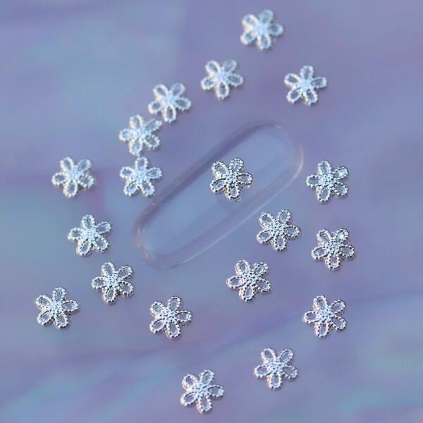 Körömdekoráció ezüst színű fém virágforma. Glue gél segítségével tartósan a körömfelületre fixálható. Jól kombinálható ezüst színű fém szórógyöngyeinkkel.