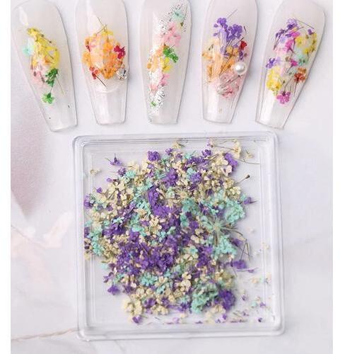 Szárított körömdíszítő virágok tégelyben. Kiváló kellék műkörömépítéshez, körömdíszítéshez. A tégely átmérője 5,5 cm. Vegyesen tartalmaz többféle szárított virágot.