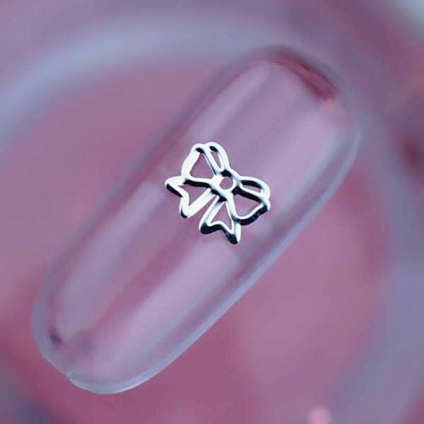 Metál körömdíszítő lemez, ezüst masni. Egyszerűen használható, hajlítható körömdíszítő mely kiválóan kombinálható ezüst színű szegecseinkkel, változatos színvilágú strasszköveinkkel.