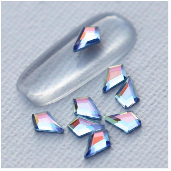 Strassz formakő Light Sapphire AB színben, , deltoid. Színvilága és egyedi formája végett sokrétű díszítő, körömre ragasztva vagy mandalák, ajándéktárgyak felületének dekorálásához kíválóan alkalmazható. Flatback no hotfix típusú üvegforma.