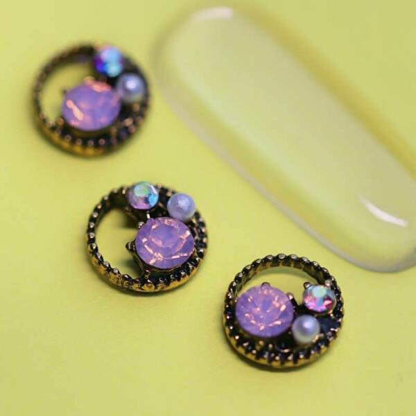 Strasszköves körömdísz óarany rusztikus kerek forma Crystal AB strasszkővel, pink opál nagy kővel és fehér gyönggyel díszítve. Glue géllel könnyen rögzíthető, önmagában is feltűnő díszítő. Kiválóan kombinálható grafszürke szórógyöngyeinkkel, különleges díszítőinkkel.