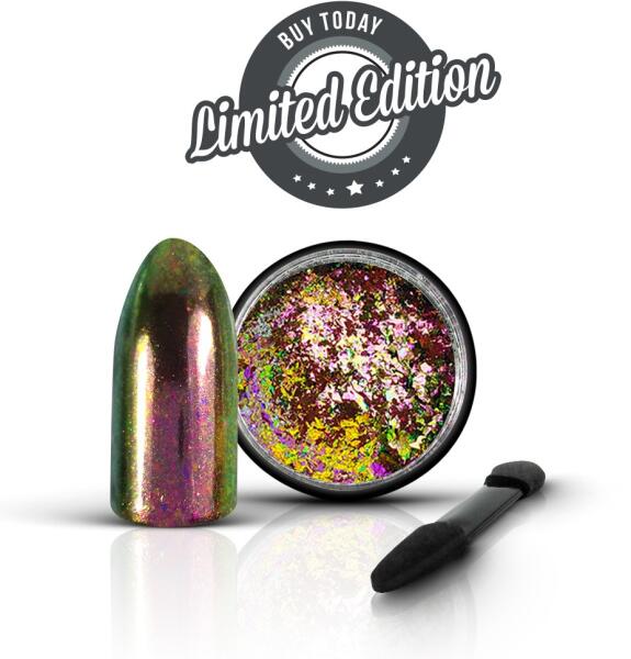 Kaméleon effekt Tetszőleges színű LeGrande (fixálásmentes) Színes Zselét kenjünk fel a köröm felületére és 1 percig köttessük UV lámpában. Szivaccsal vagy Applikátor segítségével dörzsöljük bele a Magic Flakes-et és köttessük további 1 percig. Ezután Glossy Top Gel fixálásmentes fényzselével fedjük, ügyelve az élek lezárására majd kötessük 2 percig.