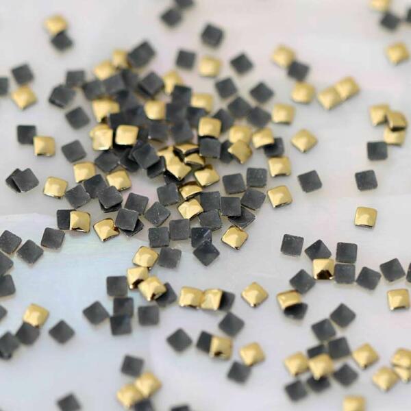 Szegecs körömdísz négyzet formában arany színben, nagyszerűen kombinálható különböző méretű és formájú szegecseinkkel, arany színű szórógyöngyeinkkel, szikrázó strasszköveinkkel. Vékony, hőre olvadó ragasztórétegének köszönhetően ruhadíszítésre is kiválóan alkalmas.