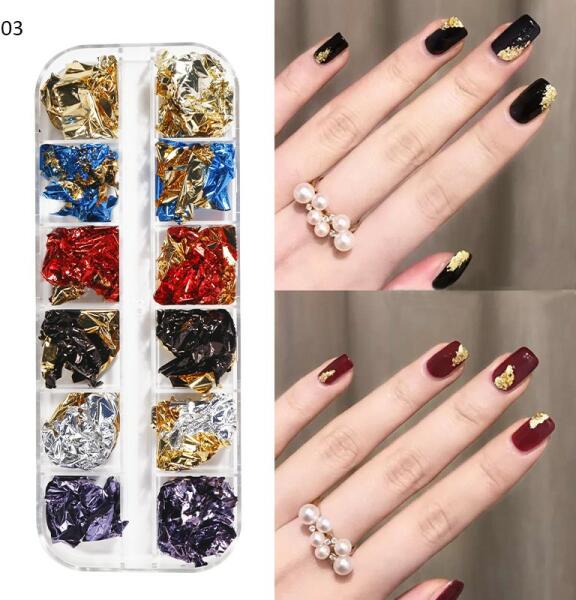 Leheletfinom, pehelykönnyű fólia darabok. Ragacsos felületre óvatosan felvihető, vagy beleépíthető különböző acrilokba, zselékbe.
