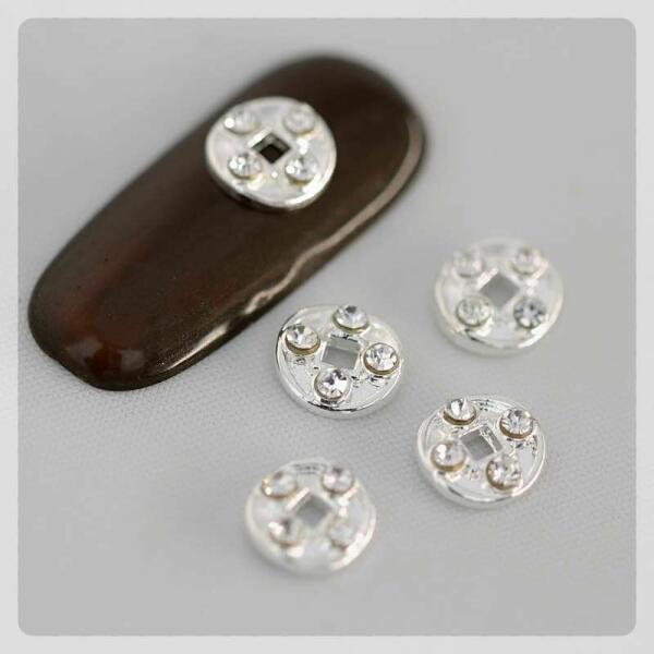 Strasszköves körömdísz, közepes ezüst kerek forma crystal kövekkel. Alul ívelt, ezért könnyen fekszik fel a köröm felületére. Glue gél alkalmazása ajánlott rögzítéséhez. Egyedi extrém díszítő különleges alkalmakhoz.
