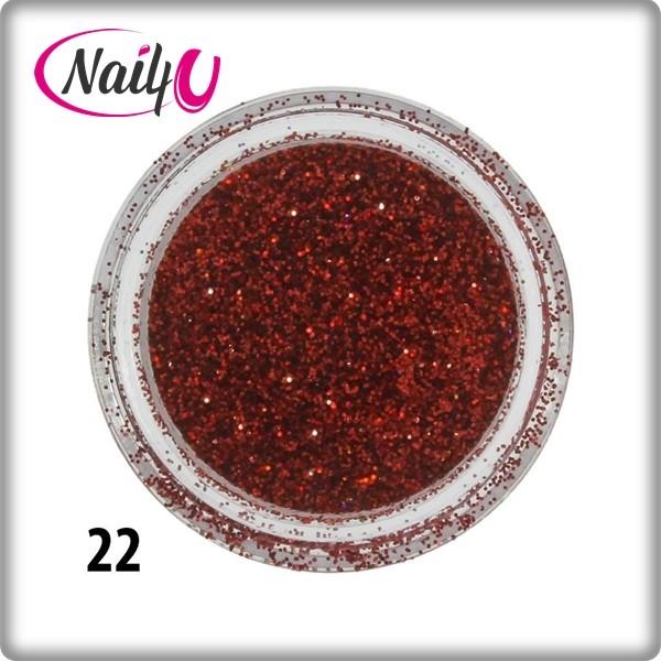 Csillámpor 22. , piros színben. A körömdíszek között a leginkább népszerű körömdíszítő anyag. Töretlen népszerűsége a kedvező ár mellett, a széleskörű felhasználhatóságnak is köszönhető. Használhatjuk szinte bármilyen körmön. Tehetjük felületre, beépíthetjük, vagy akár az építő anyaghoz is keverhetjük. A végeredmény; káprázatos csillogás, egyszerűe